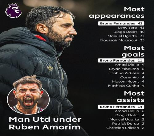 阿莫林執教期間,B費是曼聯英超出場、進球、助攻最多的球員