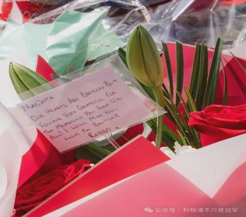 我在網絡上搜索著羅伯遜和若塔的圖片,除了那一張張擁抱和歡笑的照片,還有一張卡片,那是羅伯遜在七月份在安菲爾德球場外悼念若塔、敬獻鮮花時,寫給若塔的卡片: