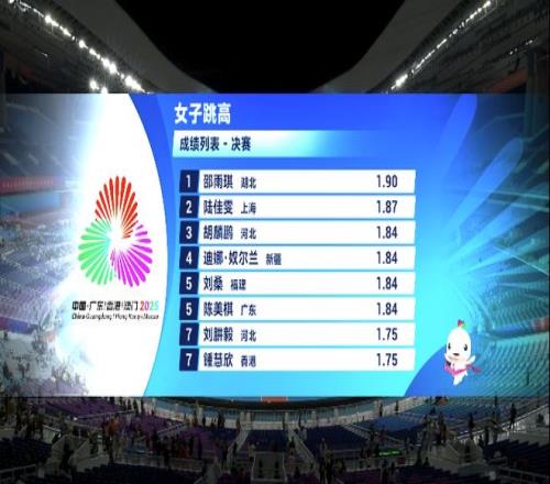 十五運會田徑女子跳高比賽中,上海運動員陸佳雯成功越過1米87的高度,獲得銀牌,湖北隊邵雨琪獲得金牌,河北隊胡麟鵬獲得銅牌。