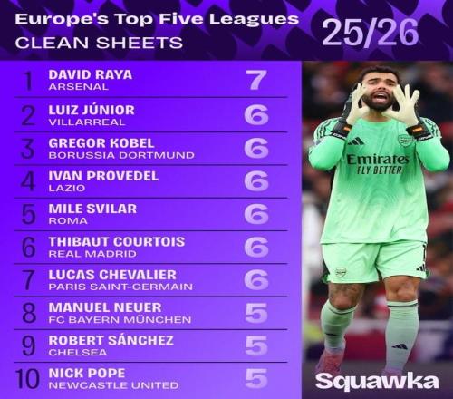 數據統計機構Squawka統計出本賽季截至目前五大聯賽門將零封榜,戴維-拉亞7次零封居首。