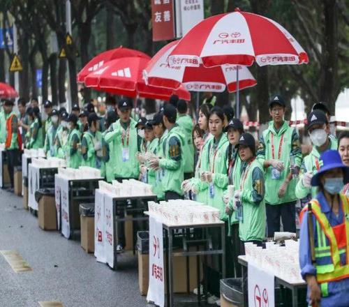 考慮到比賽當日可能出現(xiàn)較高氣溫,廣馬組委會不僅在賽道沿途增設了噴淋設施,也增加了降溫海綿、冰塊等防暑物資補給。