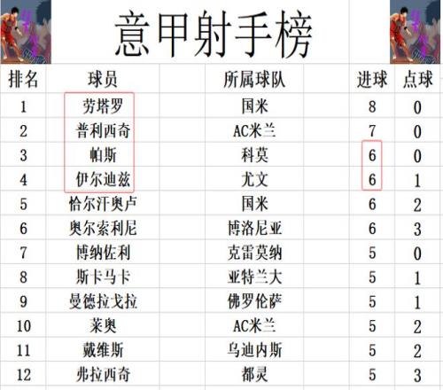 射手榜方面,意甲依然是五大聯賽唯一無人進球上雙的聯賽,勞塔羅8球繼續領跑,普利西奇7球位列第2。伊爾迪茲今天打入鎖定勝局的一球,帕斯傳射建功,他們追上恰爾汗奧盧和奧爾索利尼,4人6球并列第3。