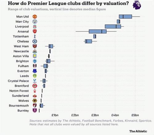 這些身價區間的數據,綜合了TA、足球基準(Football Benchmark)、福布斯(Forbes)、金奈德咨詢(Kinnaird)以及體育財經網(Sportico)的估值結果。