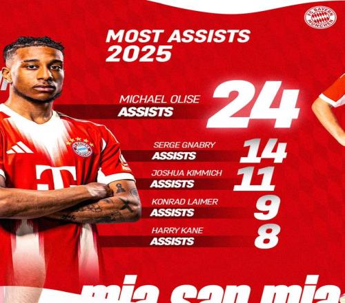 拜仁隊(duì)內(nèi)2025年度助攻榜: