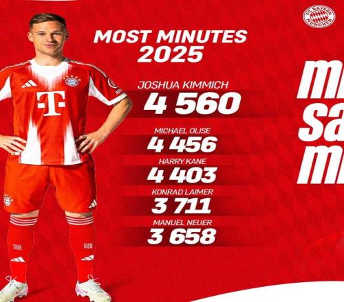 拜仁隊(duì)內(nèi)2025年度出場(chǎng)時(shí)間榜: