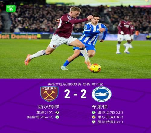北京時間12月31日,英格蘭足球超級聯賽第19輪展開角逐,西漢姆聯坐鎮主場迎戰布萊頓。比賽伊始,帕奎塔助攻鮑恩率先破門,維爾貝克通過點球為布萊頓扳平比分。不久之后,維爾貝克再次主罰點球,但未能命中。上半場補時階段,帕奎塔點射幫助西漢姆聯再度領先。進入下半場,費爾特曼抓住機會打入一球,為布萊頓扳平比分。最終,雙方以2比2握手言和。