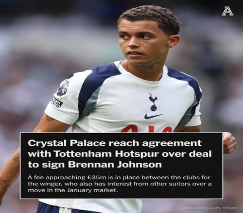 12月30報道 據The Athletic名記奧恩斯坦報道,水晶宮已經與熱刺達成協議,以近3500萬鎊轉會費簽布倫南·約翰遜。球員仍需在交易最終確定前決定自己的未來,雙方協商的轉會費接近3500萬鎊(折合歐元約4000萬歐)。目前,約翰遜也吸引了其他球隊在一月轉會窗的興趣。2023年夏窗,布倫南·約翰遜以5500萬歐轉會費從諾丁漢森林加盟熱刺,本賽季球員為熱刺出戰22場比賽,打進4球,德轉身價3500萬歐。