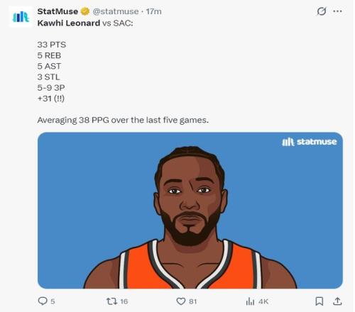末節國王就沒上主力直接繳械投降,但快船這邊為了穩定局勢,倫納德、瓊斯、桑德斯、巴圖姆、尼德豪澤五人繼續打,快船再度將分差拉開到40分以上,隨后小卡也被換下了,他全場比賽33分5籃板5助攻3搶斷1蓋帽。