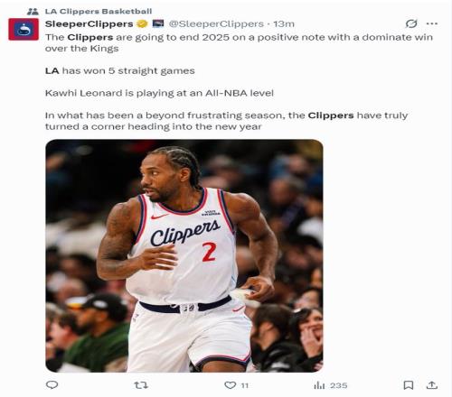船媒:快船用一場完勝為2025年畫上完美句號,我們已經豪取五連勝,萊昂納德的競技狀態達到最佳陣容級別,在經歷了令人沮喪的開賽階段后,快船在新的一年到來之際迎來了轉機。