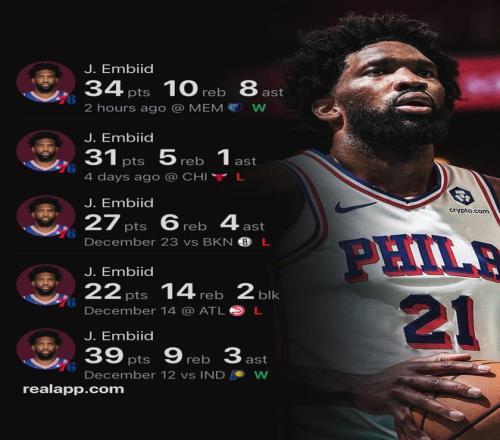 過去5場(chǎng)比賽,恩比德場(chǎng)均拿下30.6分8.8板3.4助1.4斷0.6帽,但命中率只有47.6%,本場(chǎng)比賽更是恩比德本賽季首次連續(xù)兩場(chǎng)交出30+得分表現(xiàn)。