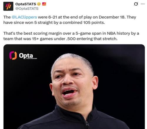 憑借這樣的表現(xiàn),快船隊不僅拿下現(xiàn)存最長的5連勝,還成為NBA歷史上50%勝率以下(至少15場)球隊5連勝的凈勝分新紀錄,過去5場比賽快船隊凈勝105分。