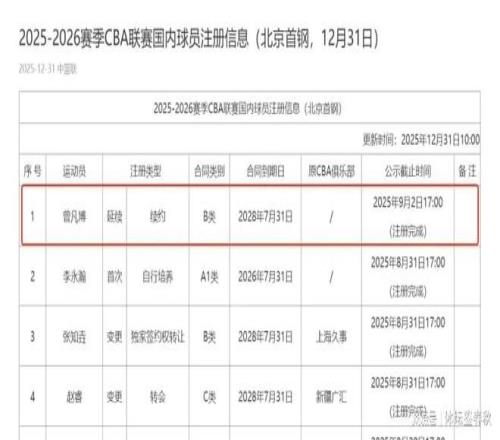 2025年的最后一天,北京首鋼傳來好消息。CBA官方在這一天更新了球員注冊信息,曾凡博的名字終于重新出現在北京男籃的名單中。3年B類合同,到期時間寫得清清楚楚,2028年7月31日。拖了近半年的續約,在年末這一天畫上句號,也算給球迷們吃了一顆定心丸。