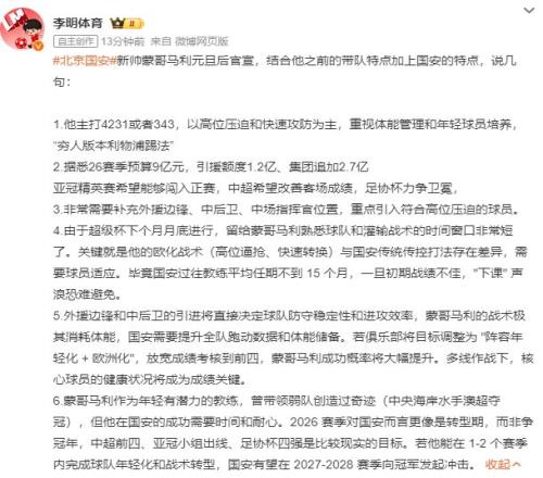 周四,博主李明體育透露,北京國安2026賽季預(yù)算9億,引援額度1.2億,目標(biāo)是“亞冠精英賽希望能夠闖入正賽”“足協(xié)杯衛(wèi)冕”。