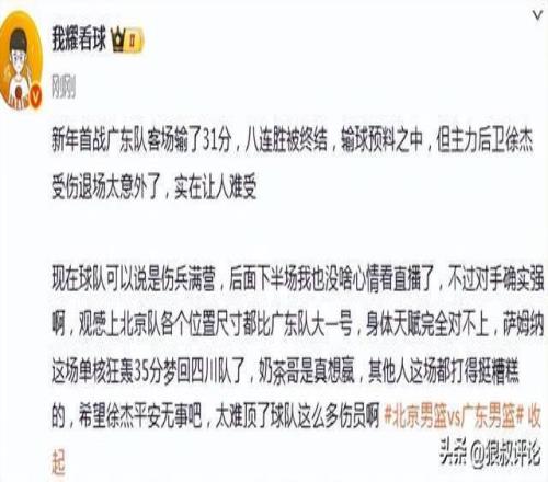 博主“我耀說球”發(fā)文點(diǎn)評:新年首戰(zhàn)廣東隊客場輸了31分,八連勝被終結(jié),輸球預(yù)料之中,但主力后衛(wèi)徐杰受傷退場太意外了,實(shí)在讓人難受。