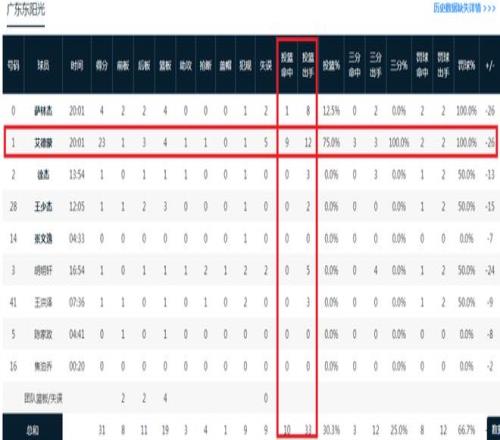 廣東上半場除薩姆納12中9得到23分外,其余球員合計(jì)21中1,且其余球員前20中0。