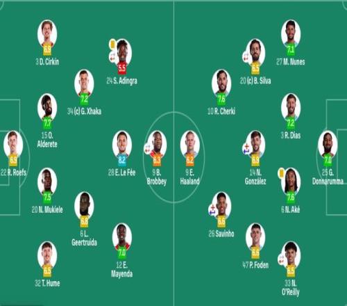 曼城首發:25-多納魯馬、27-努內斯、3-魯本·迪亞斯、6-阿克、33-奧賴利、14-尼科·岡薩雷斯(46'16-羅德里)、20-B席(85'4-賴因德斯)、26-薩維尼奧(51'11-多庫)、47-福登、10-謝爾基、9-哈蘭德