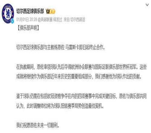 先來看看切爾西的神操作,1月1日晚上的一則消息,令多少球迷會心一笑。切爾西足球俱樂部官方宣布,與主教練馬雷斯卡終止合作。