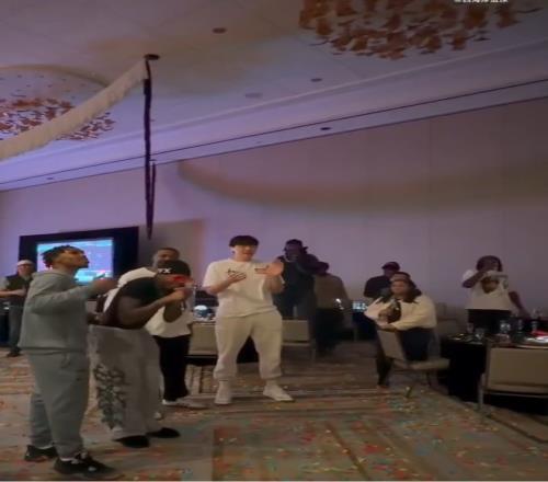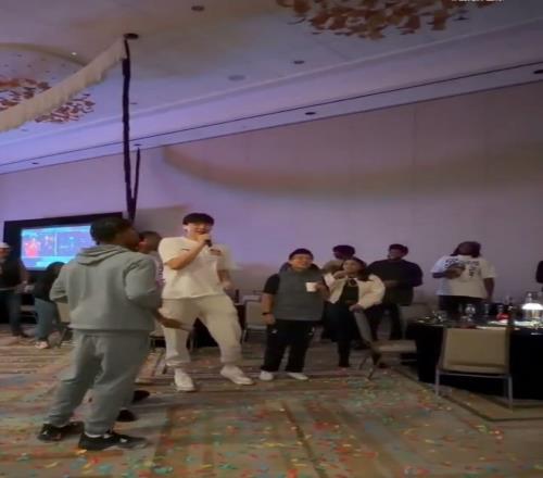 按照NBA的傳統,新秀樂福領唱生日歌,楊瀚森同為新秀也在一旁跟著唱。