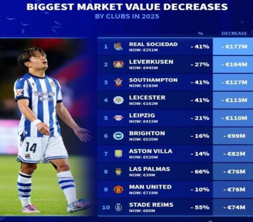 2025年已經(jīng)結(jié)束,《轉(zhuǎn)會(huì)市場(chǎng)》也統(tǒng)計(jì)了年度球隊(duì)身價(jià)貶值榜,皇社、藥廠分列前二。2025球隊(duì)身價(jià)貶值榜:歐元