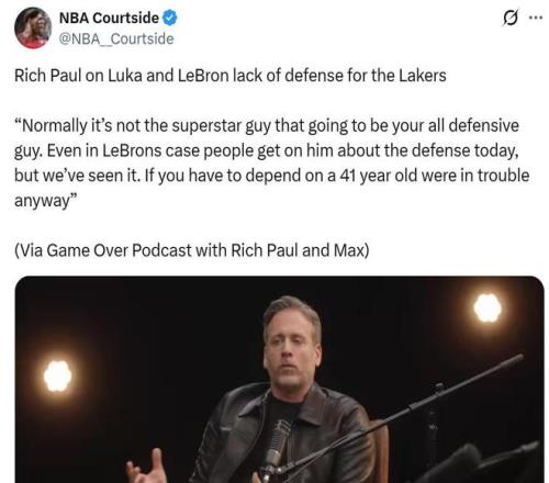 作為其經紀人的里奇保羅則在節目中公開為詹姆斯辯解道:“如果一支球隊還想依靠41歲的老將來防守,那么這支球隊肯定是遇到了大麻煩。”