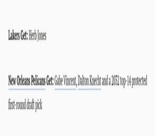 鵜鶘得到:文森特+克內克特+湖人32年前14順位保護首輪簽。