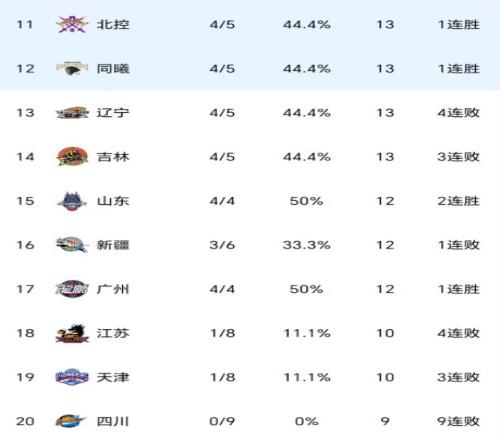 此外,昔日總冠軍遼寧隊遭遇一波4連敗之后,排名跌至第十,此前一度高居第三位,上賽季常規(guī)賽第二的山西隊,同樣遭遇4連敗,不過排名位列第七。