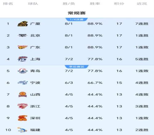 從積分榜情況來看,衛(wèi)冕冠軍廣廈隊憑借一波七連勝高居榜首,北京隊、廣東隊都是近期輸過比賽,分列第二、第三,爭冠第一集團白熱化。