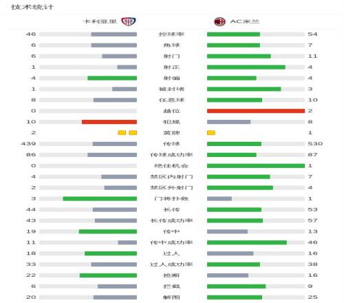 第49分鐘,拉比奧右路傳中,萊奧禁區后點爆射破門,米蘭1-0卡利亞里