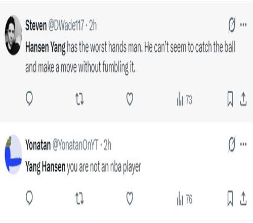 美球迷:楊瀚森是隊內傳球能力最差的,他就連接球并順利傳球都困難,很多次都是失誤;楊瀚森就不是一個NBA級別的球員。