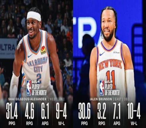 攤開數據,亞歷山大12月場均31.4分4.6籃板6.1助攻,出色表現下,雷霆打出9勝4負,依舊是穩定運轉的衛冕機器。而布倫森也同樣不差,場均30.6分7.1助攻,帶隊尼克斯10勝4負。