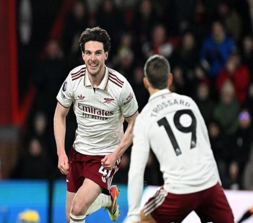 第71分鐘,厄德高斜傳,薩卡突入禁區(qū)倒三角傳球,賴斯跟進(jìn)推射得手,阿森納3-1伯恩茅斯。這是身價(jià)1.2億歐元的賴斯,生涯首次在英超梅開(kāi)二度。