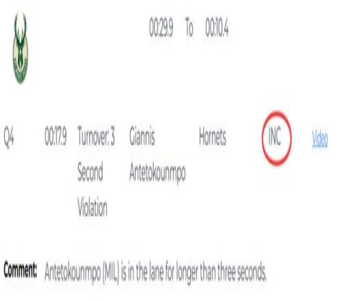 唯一一次漏判發生在距離比賽結束還有17.9秒,報告指出,字母哥在對方禁區停留時間超過3秒,這是一次漏吹的3秒違例。雄鹿獲利,黃蜂吃虧。