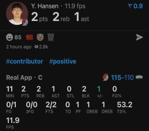 楊瀚森替補出戰約11分鐘,投籃1中0,罰球2中2得到2分2板(1前場板)1助2帽,其中封蓋數全隊第一,幫助開拓者115-110干翻高居西部第二的馬刺。