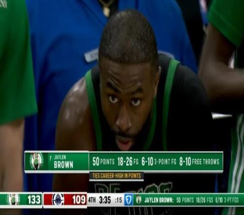 他在末節3分44秒就被換下,否則打破生涯得分紀錄輕而易舉。當然我有種預感,50分可能還不是他這賽季的最高分,杰倫-布朗最近的狀態太火熱了。