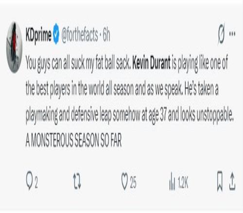 杜蘭特球迷組織:杜蘭特整個(gè)賽季的表現(xiàn)堪稱(chēng)世界最頂級(jí),這場(chǎng)比賽也如此。他以 37 歲的高齡在傳球能力和防守能力上都有提升,本賽季看起來(lái)勢(shì)不可擋。迄今為止,他打出了一個(gè)極其出色的賽季。