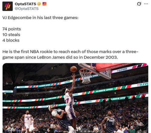 這讓他成為03年詹姆斯之后,首位能夠在新秀賽季連續(xù)3場比賽中交出至少這一數(shù)據(jù)的球員。