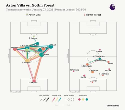 本場比賽的傳球網(wǎng)絡(luò)圖進(jìn)一步凸顯了這種持續(xù)的控球流轉(zhuǎn)。維拉經(jīng)常將右路作為推進(jìn)進(jìn)攻的主要方向。隨著右后衛(wèi)馬蒂-卡什解禁復(fù)出,球隊(duì)42%的進(jìn)攻三區(qū)觸球來自球場右路三分之一區(qū)域——這是他們本賽季英超第二高的比例。