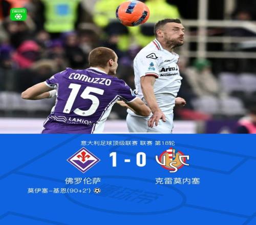 北京時間1月4日22:00,意甲聯賽第18輪,佛羅倫薩坐鎮主場迎戰克雷莫內塞。上半場,皮科利造點被取消;下半場補時階段,莫伊塞-基恩替補登場攻入全場唯一進球,幫助球隊完成絕殺。最終,佛羅倫薩以1-0戰勝克雷莫內塞,暫升到第18名,落后安全區2分。