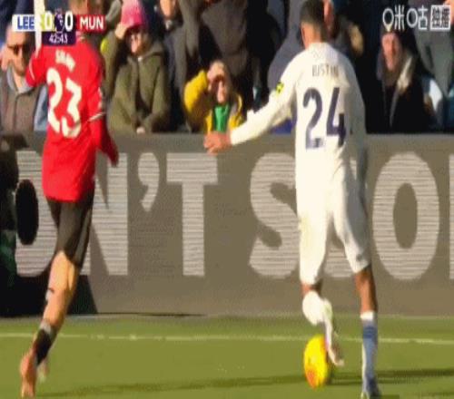 第45分鐘,雙方拼搶,賈斯廷倒地后順勢踢到了盧克-肖的屁股