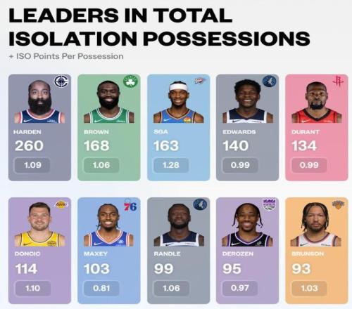 美媒Basketball University統(tǒng)計了本賽季截止目前NBA的單打次數(shù)及單打效率榜,哈登以260回合斷崖式領(lǐng)先,亞歷山大則是每回合得分最多的球員。