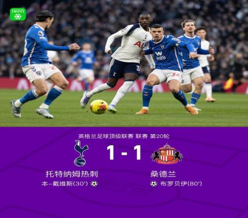 北京時間1月4日,英格蘭足球頂級聯賽第20輪,托特納姆熱刺坐鎮主場迎戰桑德蘭。比賽上半場,庫杜斯因傷離場,穆阿尼替補出戰,之后范德芬送出助攻,本-戴維斯破門得分,幫助主隊取得領先。下半場勒費埃搶點頭球攻門擊中立柱彈出,隨后勒費埃為布羅貝伊創造機會,后者成功破門扳平比分。全場戰罷,最終雙方以1比1握手言和。