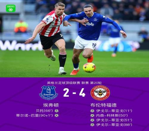 北京時間1月4日,英格蘭足球超級聯賽第20輪,埃弗頓坐鎮主場迎戰布倫特福德。比賽中,布倫特福德前鋒伊戈爾-蒂亞戈完成帽子戲法,內森-科林斯建功。埃弗頓方面,格拉利什助攻雙響,貝托、蒂爾諾-巴里破門。最終全場戰罷,埃弗頓以2比4不敵布倫特福德。
