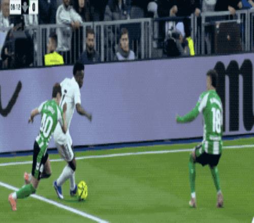 本場比賽,姆巴佩因傷缺陣,貢薩洛·加西亞首發出場。開場之后,維尼修斯就在右路多次過人成功,貝蒂斯防線明顯頂不住。
