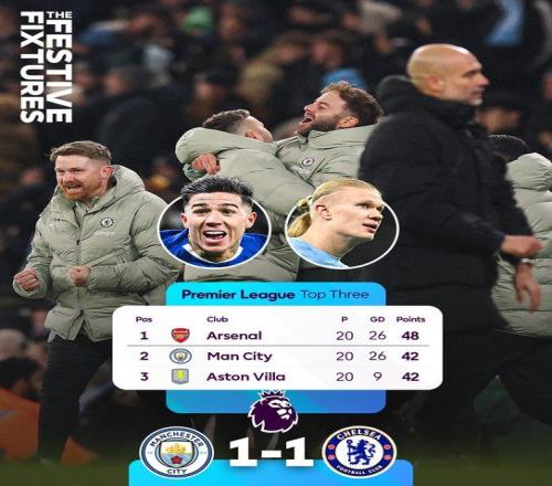 北京時間1月5日01:30,英超聯賽第20輪,曼徹斯特城坐鎮伊蒂哈德球場迎戰切爾西。上半場哈蘭德中柱,賴因德斯爆射建功,切爾西零射正,曼城暫1-0切爾西;下半場內托失良機,格瓦迪奧爾傷退,恩佐絕平,最終曼城1-1切爾西,距榜首6分。
