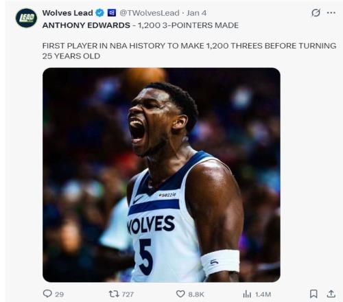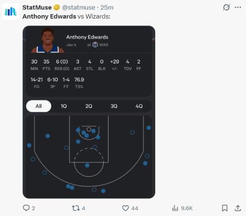北京時間1月5日,森林狼141-115大勝奇才拿到二連勝。這場比賽森林狼在客場碾碎了奇才,首節森林狼就領先10分,第三節更是一波35-21直接將比賽打入垃圾時間,狼王愛德華茲三節35分打卡下班,不過此役愛德華茲在賽后遭到了一些質疑。