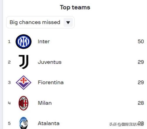 此戰勞塔羅3次浪費“黃金機會”,小圖拉姆和皮奧各有1次,單場比賽就5次浪費良機,也讓國米在意甲浪費黃金機會的榜單上的領先優勢進一步擴大——50次浪費黃金機會的國米,領先第二名已達21次之多。