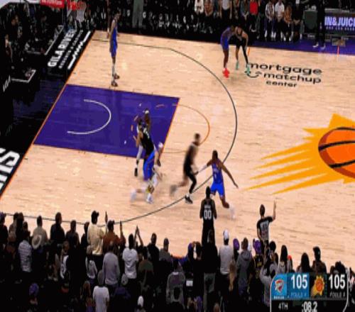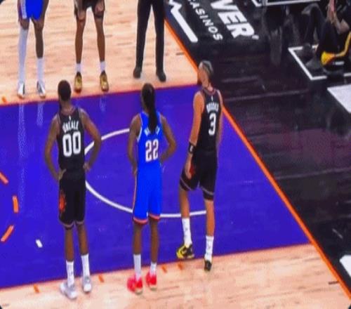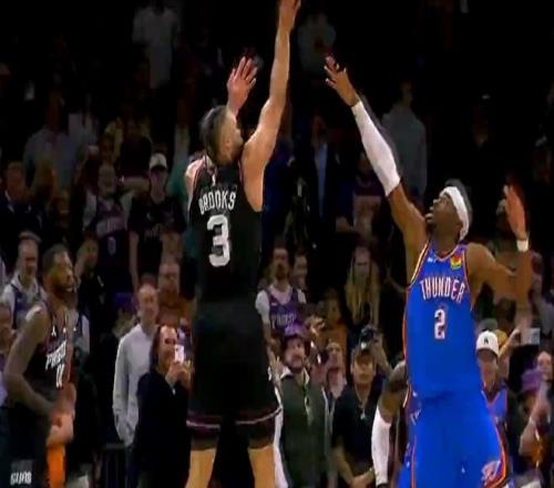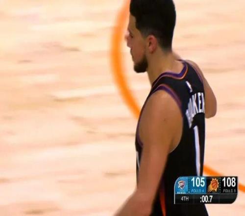 最后8.2秒,奧尼爾成功解決了世界性難題——邊線發球。布克接球后,手握雷神之錘,面對雷霆倆個瘋狗式防守的卡魯索和多特,3分線外強行干拔,一劍封喉,絕殺雷霆。
