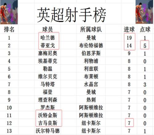 射手榜方面,哈蘭德錯失良機未能進球,還是19球領跑。蒂亞戈今天上演帽子戲法,大幅度縮小和哈蘭德差距,5球之差仍排第2。吉馬良斯今天打入一球,追上福登,理查利森,羅杰斯等人7球剛好擠入前十。
