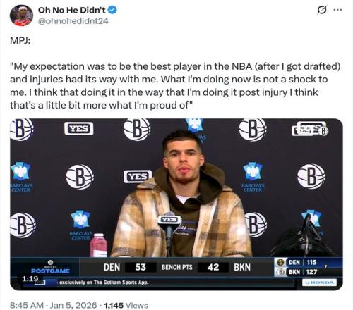 由于約基奇、卡梅隆約翰遜、瓦蘭等數名核心輪換缺席,掘金隊輸給勢頭正盛的籃網并不讓人意外。