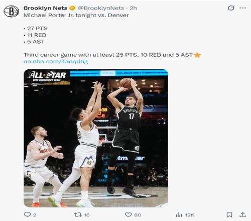 籃網官方也寫道,小波特加盟球隊后已經拿到了三場25+10+5的數據,這是在掘金生涯非常罕見的存在,而且小波特加盟籃網27場已經已經拿到698分是隊史第六高的。